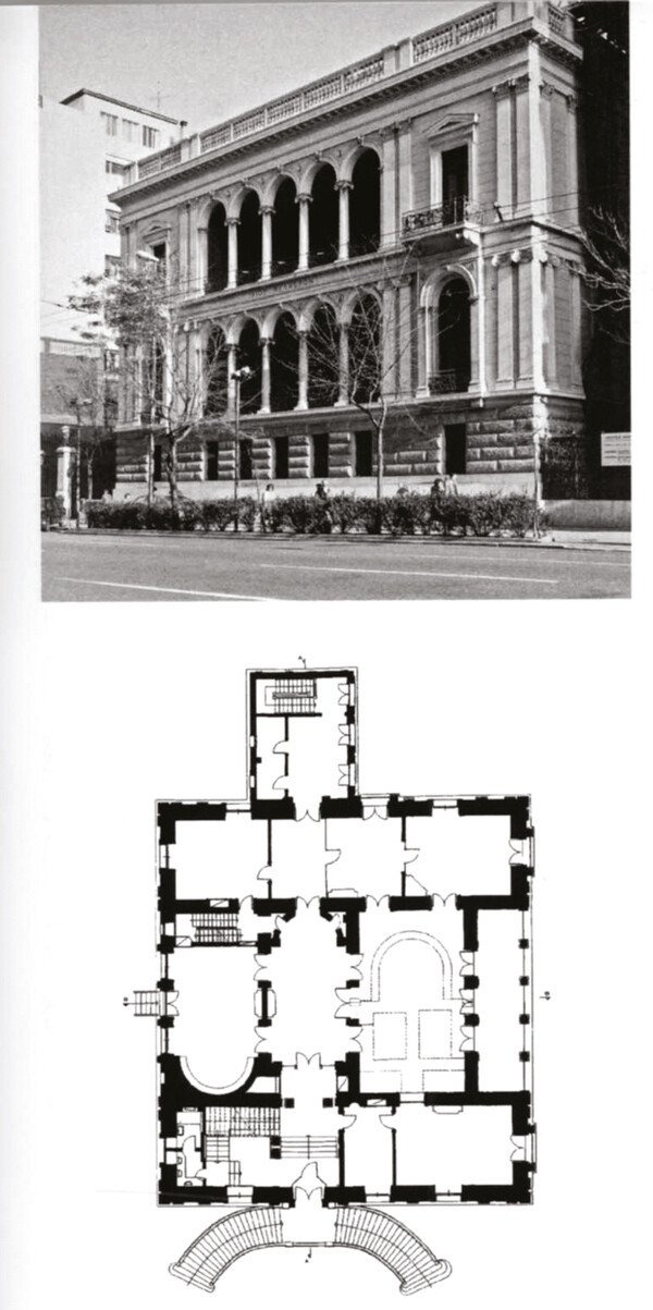 Σημαντικό κτίριο της ύστερης νεοκλασικής αρχιτεκτονικής, διώροφο, το κεντρικό τμήμα της όψης του οποίου θυμίζει τη δυτική όψη της Βιβλιοθήκης του Αδριανού, στην Πλάκα. Κατασκευή: 1895-1901. Στο οικοδομικό τρίγωνο μεταξύ των οδών Αγίου Κωνσταντίνου 22-24, Μενάνδρου, Σατωβριάνδου και Κουμουνδούρου.
