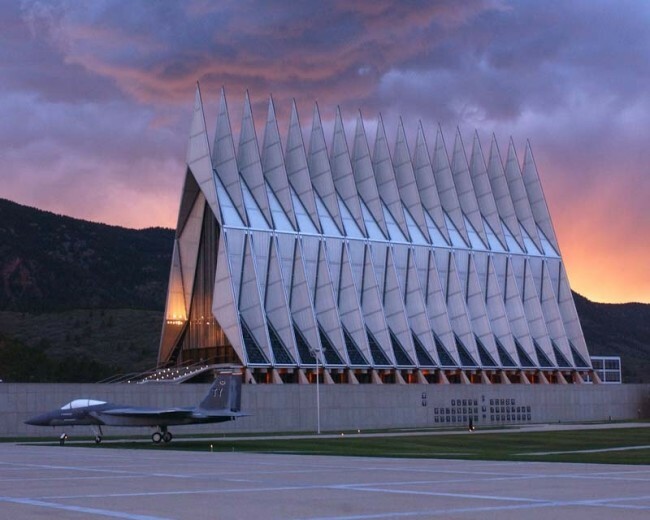 Ένα Αμερικανικό Εθνικό ιστορικό ορόσημο , που μοιάζει περισσότερο με ένα σκάφος εξωγήινων από ένα παρεκκλήσι . Το Air Force Academy Chapel έχει τρεις διακριτές περιοχές λατρείας : την προτεσταντική την Καθολική και την Εβραϊκή. Έχει επίσης χώρο για τους Βουδιστές και δωμάτια για μικρές θρησκευτικές ομάδες.