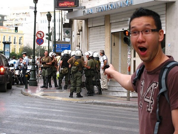 Οι Γιαπωνέζοι ζουν το μύθο τους στην Ελλάδα. Στα προχθεσινά επεισόδια παρέα τριών Γιαπωνέζων προσπαθεί να απομακρυνθεί από το «πεδίο της μάχης».